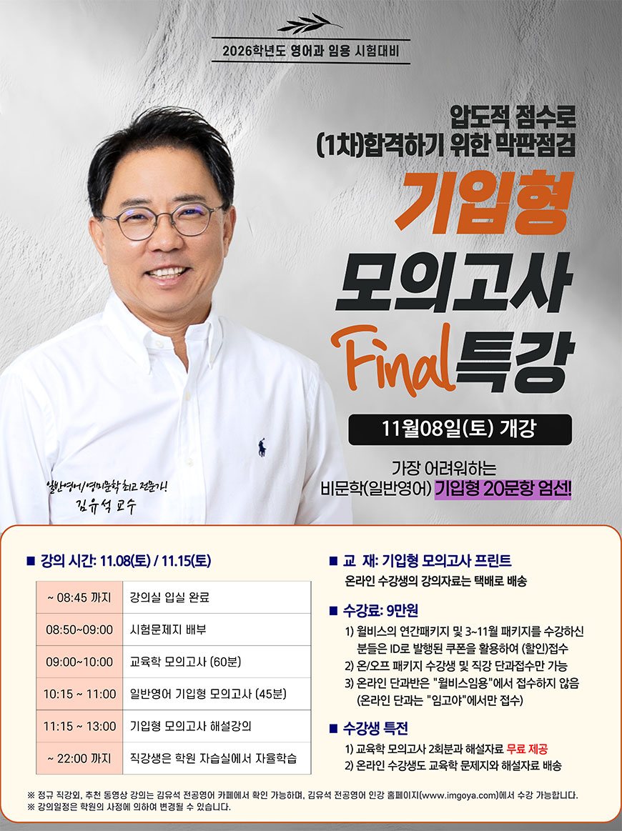 과목 | 강좌명 | 개강일 | 수강료 | 비고 | 전공영어 김유석 교수 ☞수강신청 | 기입형 모의고사 Final특강 | 2025년 11월 08일(토, 직강기준) 인강은 11월10일 등록됩니다. | ₩90,000 | - 2회 과정 | ◈ 2025연간패키지, 재도약패키지 수강생 할인 - 수강료 할인 9만원 → 8만원 - 해당 패키지 결제자가 아님에도 할인강의를 신청 하시면 모두 취소/환불됩니다. ◈ 강의 일정 - 2025년 11월 8일, 15일 (총 2회 과정) - 인강 등록은 11월 10일 예정입니다.(문제지 수령이 11~12일 예상) ◈ 강의 내용 - 수험자들이 제일 어려워하는 비문학(일반영어) 기입형 문항을 정복하기 위한 다양한 지문 읽는 방법과 답안근거 및 유추방법 강의 - 교육학 모의고사 2회분 문제 및 해설자료 제공 ※ 강의 교재 - 모의고사 프린트(택배발송) - 11월10일 일괄발송됩니다. | 09:00~10:00 | 교육학 모의고사( 60분) | | 10:15~11:00 | 기입형 모의고사( 45분) | | 11:15~13:00 | 해설 강의 | | |